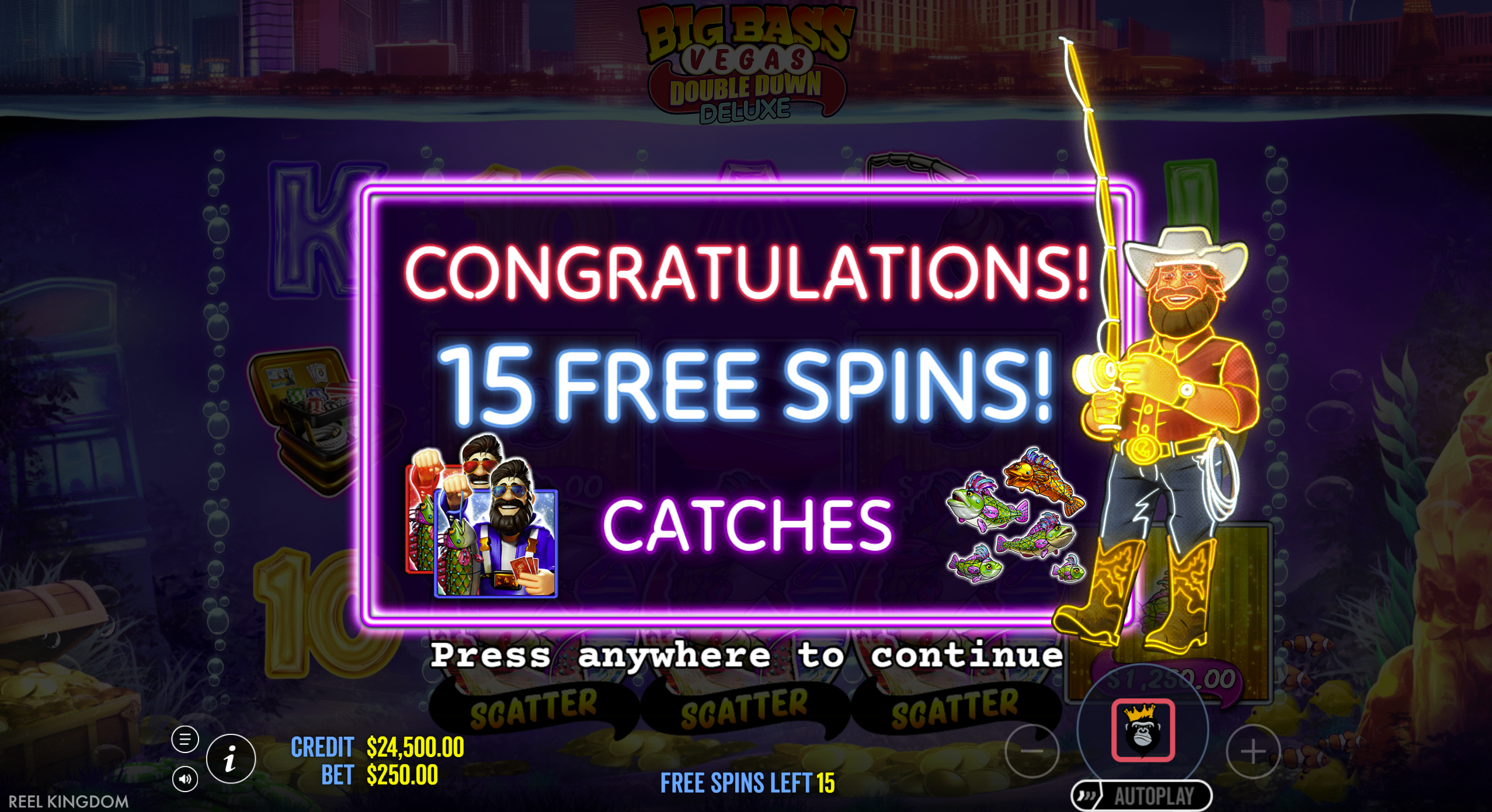 Free spins get a major boost with random starting multipliers. Starting bonus rounds with 5x or 10x multipliers greatly increases winning potential from the first spin. Combined with sticky Fisherman Wild and retriggers, this creates the most powerful bonus potential in the series.